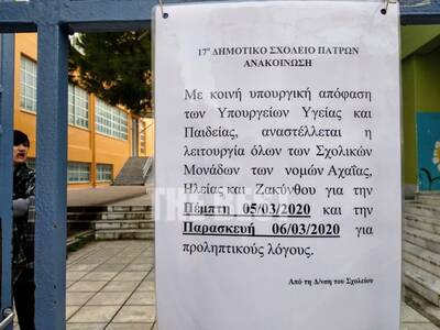 Θυμίζουμε, ότι από τον Δήμο Πατρέων, ανακοινώθηκε ήδη από χθες το βράδυ, ότι σήμερα Πέμπτη 5 και αύριο Παρασκευή 6 Μαρτίου, θα παραμείνουν κλειστά, το Δημοτικό Βρεφοκομείο, οι Παιδικοί Σταθμοί, τα ΚΔΑΠ και τα ΚΔΑΠ ΜΕΑ, τα ΚΑΠΗ του Δήμου, καθώς και το Χορευτικό Τμήμα του Πολιτιστικού Οργανισμού του Δήμου.