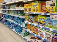 Σημερινές φωτογραφίες από σούπερ μάρκετ με γεμάτα ράφια.