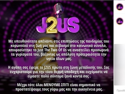 "Με υπευθυνότητα απέναντι στις επιπτώσεις της πανδημίας του κορωνοϊού στη ζωή μας και σεβασμό στο κοινωνικό σύνολο, αποφασίστηκε το Just the 2 of us να αναστείλει προσωρινά τα γυρίσματά του, βάζοντας ως απόλυτη προτεραιότητα την υγεία όλων μας. Η αγάπη σας έφερε το J2US πρώτο στη ζώνη μετάδοσής του. Σας ευχαριστούμε για την τόσο θερμή υποδοχή και ευχόμαστε να είμαστε πολύ σύντομα ξανά κοντά σας.