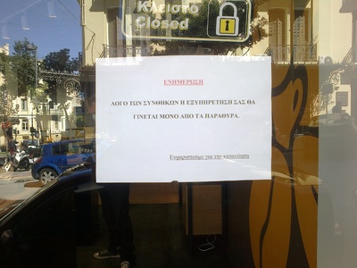 Σε καφέ –take away έχει μπει η ένδειξη πως πλέον οι καφέδες στο πλαστικό ποτήρι δίνονται από το παραθυράκι του μαγαζιού όπως και τα ρέστα και όχι εντός των χώρων.