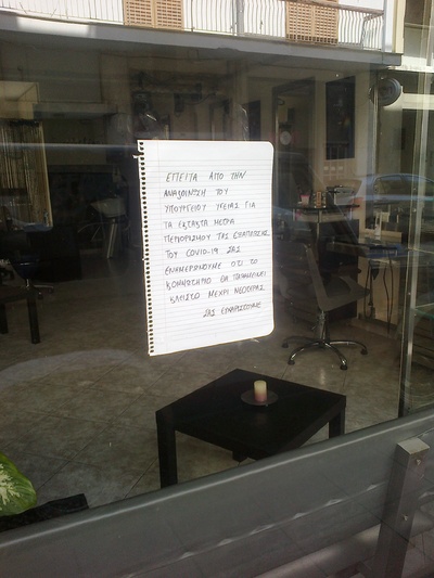 Σε πολλά μαγαζιά έχουν μπει στο τζάμι της εισόδου χαρτιά ενημερωτικά ότι έχουν κλείσει λόγω των μέτρων της κυβέρνησης και του Υπουργείου Υγείας και μαζί υπάρχει η ευχή να τα ξαναπούμε όλοι υγιείς προσεχώς. Σε άλλα μαγαζιά έχουν αναρτηθεί τηλέφωνα επικοινωνίας για παράδοση κατ’ οίκον, από φαγητά – delivery, λουκουμάδες μέχρι ποτά, κ.α. Σε κομμωτήρια επίσης αντίστοιχες ενημερώσεις στην είσοδο πως έπειτα τις ανακοινώσεις του Υπουργείου Υγείας και ως μέτρο προστασίας κατά της εξάπλωσης του κορωνοϊού, έχουν κλείσει μέχρι νεοτέρας.