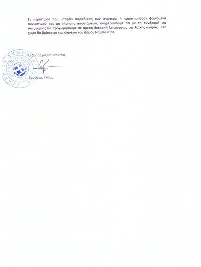 Σε περίπτωση που υπάρξει παραβίαση των ανωτέρω ή παρατηρηθούν φαινόμενα συνωστισμού και μη τήρησης αποστάσεων, ο Δήμος Ναυπακτίας έχει ενημερώσει με έγγραφό του το Σύλλογο Παραγωγών Ναυπάκτου και Πεδιάδας Κάμπου Μόρνου ότι με τη συνδρομή της Αστυνομίας θα προχωρήσει σε άμεση διακοπή λειτουργίας της λαϊκής αγοράς. Στο χώρο θα βρίσκεται κλιμάκιο του Δήμου Ναυπακτίας και προσωπικά ο Δήμαρχος Βασίλης Γκίζας.