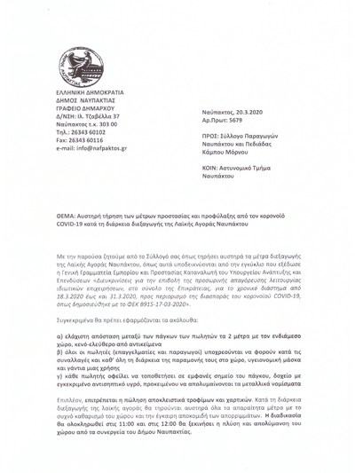 Ο Δήμος Ναυπακτίας ενημερώνει με ανακοίνωση του, ότι προσωρινά αναστέλλεται μερικώς η λειτουργία της Λαϊκής Αγοράς της Ναυπάκτου. Αυτό σημαίνει ότι στη Λαϊκή Αγορά που θα πραγματοποιηθεί το Σάββατο 21 Μαρτίου 2020 στην περιοχή του 2ου Γυμνασίου, θα πωλούνται αποκλειστικά προϊόντα που έχουν σχέση με το φαγητό και χαρτικά. Απαγορεύεται ρητά η πώληση οποιουδήποτε άλλου προϊόντος, όπως πλαστικά, ρούχα ή βιομηχανικά είδη.