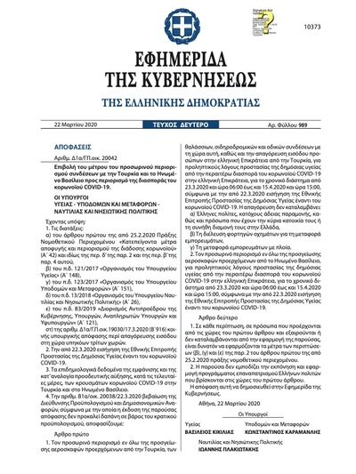 Απαγορεύονται από σήμερα το πρωί όλες οι πτήσεις από και προς την Τουρκία και την Βρετανία σύμφωνα με την ΚΥΑ που δημοσιεύθηκε στην Εφημερίδα της Κυβερνήσεως. Όσον αφορά στην Τουρκία αποφασίσθηκε ο προσωρινός περιορισμός εν όλω της προσγείωσης αεροσκαφών προερχόμενων από την Τουρκία, των θαλάσσιων, σιδηροδρομικών και οδικών συνδέσεων με τη χώρα αυτή, καθώς και την απαγόρευση εισόδου προσώπων στην ελληνική Επικράτεια από την Τουρκία, για προληπτικούς λόγους προστασίας της δημόσιας υγείας από την περαιτέρω διασπορά του κορονοϊού COVID-19 στην ελληνική Επικράτεια.