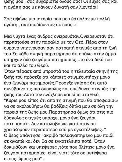 Από την πλευρά της η 42χρονη αγιογράφος μέσα από το προφίλ της στο Facebook, αναφέρεται στην περιπέτεια της χωρίς να δίνει περισσότερες λεπτομέρειες για την κατάσταση της υγείας της. Αρκείται στο να αναφέρει μόνο πως «Ξεκινώντας να νικήσω σε μια δύσκολη στιγμή της ζωής μου, σας ευχαριστώ όλους σας. Οι ευχές σας και η αγάπη σας με κάνουν δυνατή σαν λιοντάρι» ενώ κλείνει το λακωνικό post με το γνωστό ποίημα «Footprints in the sand» μεταφρασμένο στα ελληνικά.