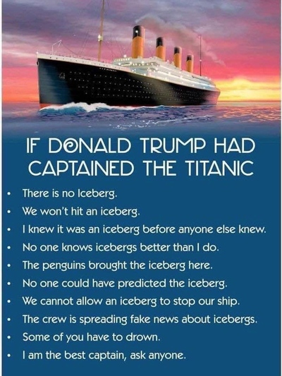 Η φωτογραφία κυκλοφορεί στα social media και όπως αναφέρει, αν ο Ντόναλντ Τραμπ ήταν καπετάνιος του Τιτανικού θα αντιμετώπιζε τα πράγματα κάπως έτσι: