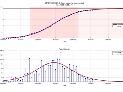Η καμπανοειδής καμπύλη προβλέπει πως περίπου στις αρχές με μέσα του Μάη, η Ελλάδα θα είναι σε θέση να φθάσει τον ελάχιστο ή μηδενικό αριθμό νέων κρουσμάτων εφόσον τα μέτρα θα εφαρμοσθούν με αυστηρότητα μέχρι τέλους και δεν συμβεί κάτι αφύσικο.
