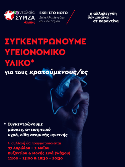"Η Νεολαία ΣΥΡΙΖΑ Αχαΐας και το Στέκι Αλληλεγγύης και Πολιτισμού «Εκεί στο Νότο» συλλέγουν είδη ατομικής υγιεινής για κρατούμενους από την Δευτέρα 27 Απριλίου έως και το Σάββατο 2 Μαϊού και ώρες από 11:00 έως 13:00 και 18:30 έως 20:30 στη διεύθυνση Βυζαντίου και Μονής Σινά (Ψάχου). Τα είδη πρώτης ανάγκης που θα συλλέγονται είναι αντισηπτικά, μάσκες, γάντια, είδη ατομικής υγιεινής (σαμπουάν, αφρόλουτρα, Οδοντόκρεμα, Οδοντόβουρτσες, Σαπούνια).