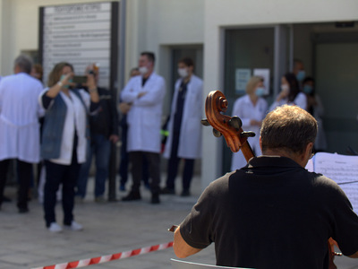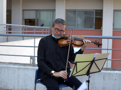 Οι μουσικοί του «Κουιντέτου», στο πλαίσιο της συνέχισης των δράσεων στήριξης του λαού της Πάτρας, που διοργανώνει ο Πολιτιστικός Οργανισμός, βρέθηκαν στον προαύλιο χώρο του Γενικού Νοσοκομείου Πατρών «Αγ. Ανδρέας» και ερμήνευσαν συνθέσεις κλασσικών δημιουργών, παίρνοντας όλα τα αναγκαία μέτρα προστασίας της υγείας, τόσο των ιδίων όσο και των εργαζομένων και των επισκεπτών.