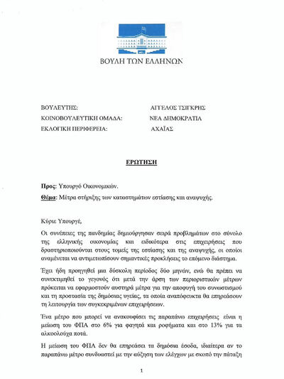 Στο πλαίσιο του κοινοβουλευτικού ελέγχου, ο βουλευτής Αχαΐας της Νέας Δημοκρατίας Άγγελος Τσιγκρής κατέθεσε ερώτηση προς τον Υπουργό Οικονομικών σχετικά με τη λήψη μέτρων στήριξης των επιχειρήσεων που δραστηριοποιούνται στους τομείς της εστίασης και της αναψυχής.