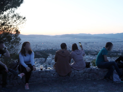 Στη δυτική πλευρά του λόφου, επίσης, νεαρά ζευγάρια, έμοιαζαν να αποξεχνιούνται με την δύση του ηλίου και αγνόησαν τις αποστάσεις.