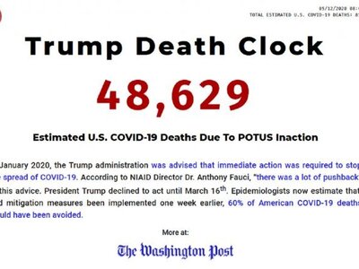 Το ρολόι των θανάτων εξαιτίας του Τραμπ»: έτσι βάφτισε ο σκηνοθέτης Γιουτζίν Τζαρέκι τον φωτεινό πίνακα που εγκαταστάθηκε πρόσφατα στην πιο πολυσύχναστη πλατεία της Νέας Υόρκης και αναγράφει τον αριθμό των θυμάτων εξαιτίας της πανδημίας του κορονοϊού στις ΗΠΑ που θα μπορούσαν να είχαν σωθεί, κατ’ αυτόν, αν ο ένοικος του Λευκού Οίκου είχε αναλάβει δράση πιο γρήγορα.