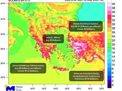 Πολύ υψηλές μέγιστες θερμοκρασίες θα σημειωθούν στη Δυτική και στη Νότια Ελλάδα (ιδιαίτερα στη Νότια Πελοπόννησο όπου τοπικά το μεσημέρι μπορεί το θερμόμετρο να δείξει 39 έως 41 βαθμούς), στην Ανατολική και Νότια Κρήτη και στα Δωδεκάνησα, κυρίως στη Ρόδο (με θερμοκρασίες έως 38-40 βαθμούς), καθώς και στην Αττική (έως 38 βαθμούς).