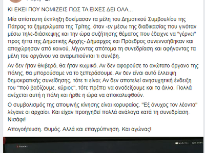 "Μία απίστευτη έκπληξη δοκίμασαν τα μέλη του Δημοτικού Συμβουλίου της Πάτρας τα ξημερώματα της Τρίτης, όταν -εν μέσω της διαδικασίας που γινόταν μέσω τηλε-διάσκεψης και την ώρα συζήτησης θέματος που έδειχνε να "γέρνει" προς ήττα της Δημοτικής Αρχής- Δήμαρχος και Πρόεδρος συνεννοήθηκαν και αποχώρησαν από κοινού, λήγοντας απότομα τη συνεδρίαση και αφήνοντας τα μέλη του οργάνου να αναρωτιούνται τι συνέβη.