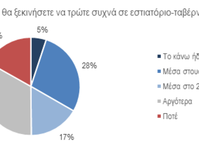 Ένας στους δύο δεν σκοπεύει να επιστρέψει στην οργανωμένη εστίαση μέσα στο 2020. Αυτό προκύπτει από έρευνα των καταναλωτών που πραγματοποίησε το Ινστιτούτο Έρευνας Λιανεμπορίου Καταναλωτικών Αγαθών (ΙΕΛΚΑ) σε δείγμα 1.050 ατόμων την περίοδο του Μαΐου 2020 με θέμα τις καταναλωτικές συνήθειες των καταναλωτών λόγω της εμφάνισης του κορονοϊού στην Ελλάδα. Ωστόσο, το 33% ή ένας στους τρεις θα ξεκινήσει άμεσα τη συνήθεια του φαγητού σε εστιατόριο-ταβέρνα, ενώ 17% αργότερα μέσα στον χρόνο.
