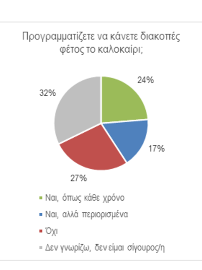 Ενδιαφέροντα ευρήματα καταγράφονται στην έρευνα του ΙΕΛΚΑ και σε σχέση με τις διακοπές. Συγκεκριμένα, ένας στους τέσσερις καταναλωτές (24%) δηλώνει ότι θα κάνει διακοπές όπως έκανε κάθε χρόνο, 17% ότι θα κάνει διακοπές, αλλά πιο περιορισμένα σε σχέση με τα προηγούμενα χρόνια. Το 27% δεν θα κάνει διακοπές φέτος ενώ ένα αρκετά μεγάλο ποσοστό 32% (1 στους 3) δεν γνωρίζει ακόμα τι θα κάνει. Η πλειοψηφία, σε ποσοστό 37%, εκτιμά ότι θα έχει τη δυνατότητα να κάνει διακοπές τον Αύγουστο, το 16% νωρίτερα από τον Ιούλιο και το 15% αργότερα μετά το καλοκαίρι μέσα στο 2020. Το 30% θεωρεί ότι δεν θα μπορέσει φέτος να κάνει διακοπές ενώ ένα 8% αναφέρει ότι δεν μπορέσει κάνει διακοπές ούτε το 2021.