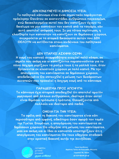 «Η Παγκόσμια Ημέρα κατά του καπνίσματος υπενθυμίζει σε όλους μας το χρέος για μια ζωή απελευθερωμένη από μια βλαβερή συνήθεια που επηρεάζει την υγεία μας. Η συνολική τελευταία προσπάθεια της πολιτείας μας βρίσκει συμμαχητές σε μια αντικαπνιστική εκστρατεία που σκοπό έχει να μειώσει τους θανάτους και στην χώρα μας από τον εθισμό της χρήσης του καπνού. Η εφαρμογή του τελευταίου νόμου δεν αποτελεί για μας μια τυπική υποχρέωση, αλλά την κορυφαία επιλογή αγωγής υγείας, που θα οδηγήσει σε πολίτες απαλλαγμένους από έναν εθισμό που ευθύνεται για ασθένειες με σοβαρές συνέπειες στην λειτουργία του οργανισμού μας» δηλώνει ο Αντιπεριφερειάρχης ΠΕ Αχαΐας και αρμόδιος για θέματα δημόσιας υγείας Χαράλαμπος Μπονάνος και προσθέτει: «Στόχος μας είναι να διατηρήσουμε τους κλειστούς χώρους καθαρούς, απαλλαγμένους από τα βλαβερά προϊόντα του καπνού. Η εστίαση των πολιτών να γίνεται σε ένα ασφαλές και υγιές περιβάλλον, που η παραμονή τους δεν θα τους μετατρέπει σε παθητικούς καπνιστές. Σε αυτή την κατεύθυνση θα κινηθούν όλα τα στελέχη της δημόσιας υγείας, στην μεγάλη προσπάθεια να περιφρουρήσουμε την πίστη εφαρμογή μιας νομικής διάταξης που προστατεύει την ίδια την ζωή» κατέληξε ο κ. Μπονάνος.