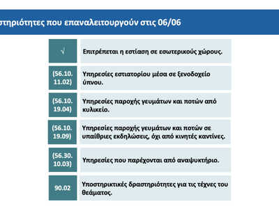 Οι κανόνες λειτουργίας των δραστηριοτήτων του 6ου και του 7ου σταδίου που επανεκκινούν στις 15 και 29 Ιουνίου, καθώς και την 1η Ιουλίου, θα ανακοινωθούν στο προσεχές διάστημα.