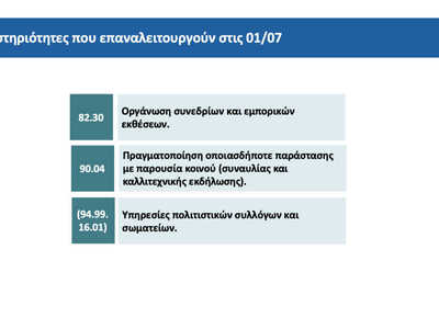 Την Τετάρτη 1 Ιουλίου επανεκκινούν οι δραστηριότητες με αντικείμενο: