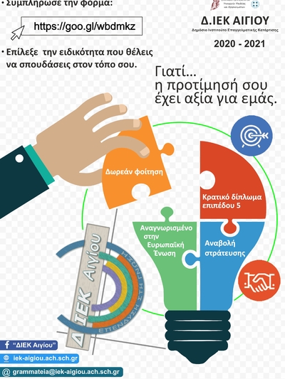 Για περισσότερες πληροφορίες μπορείτε να βρείτε στην ιστοσελίδα μας http://iek-aigiou.ach.sch.gr ή στο Facebook: ‘‘ΔΙΕΚ Αιγίου’’.