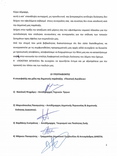 "Η κατ’ επανάληψη αυταρχική, μη προοδευτική και ξεπερασμένη αντίληψη διοίκησης που υιοθετεί ο δήμαρχος, δεν είναι ταυτόσημη με τις θέσεις των μελών της και δεν είναι αποδεκτή από την «ΠΟΙΟΤΙΚΗ ΑΙΓΙΑΛΕΙΑ», αφού αποδεικνύει απαξίωση του νομικού πλαισίου για την αυτοδιοίκηση, που επιδιώκει συναινέσεις και συνεργασίες για την επίλυση των ζητημάτων του Δήμου προς όφελος των δημοτών." σχολιάζεται στην ανακοίνωση των μελών της παράταξης. Επιπλέον, σημειώνεται: