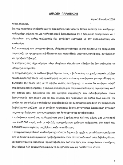 *Σας επισυνάπτουμε τη δήλωση της παραίτησης των κ. Βασιλικής Ψυχράμη, Παναγιώτη Μαρινόπουλου, Ευστράτιου Βαρδάκη, Παναγιώτη Μάρκου, Παναγιώτας Γκρέμου – Γούσα και Χριστίνας Πλατάνου, που εστάλη το μεσημέρι της Δευτέρας 22 Ιουνίου, στον Δήμαρχο και το Δημοτικό Συμβούλιο Αιγιαλείας.