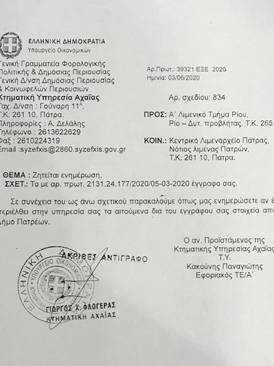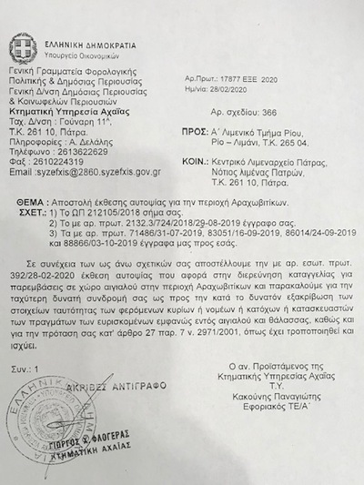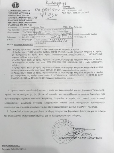 Ας σημειωθεί ότι ο Νίκος Νικολόπουλος έκανε και ξεχωριστή νύξη για την τύχη των αυθαιρεσιών του εξοχικού του Δημάρχου Κ. Πελετίδη στα Αραχωβίτικα και έλαβε την απάντηση από τον κ. Κακούνη, ότι ο τελευταίος έχει απευθυνθεί στις αρμόδιες υπηρεσίες του Δήμου και του Λιμεναρχείου για όλους και για όλα, όμως οι έγγραφες πρωτοβουλίες του μένουν αναπάντητες… Το πρώτο έγγραφο απεστάλη στις 28.2.2020 στο Λιμεναρχείο, όπου μεταξύ άλλων ζητείται η συνδρομή για την εξακρίβωση των ιδιοκτητών που έχουν κτίσματα εντός αιγιαλού και θάλασσας, με βάση τις τεχνικές εκθέσεις και τα συνημμένα τοπογραφικά αποσπάσματα, που απεικονίζονται οι παράνομες κατασκευές.. Ακολουθεί και επόμενο με ΑΠ 39321 στις 03.06.2020, με το οποίο ζητούνται οι απαντήσεις του Δήμου Πατρέων. Στις 5 Μαρτίου αποστέλλεται στο Δήμο Πατρέων και άλλο έγγραφο με ΑΠ 2131.24/177/2020 με το οποίο η Κτηματική αποστέλλει 15 φωτοαντίγραφα τεχνικών εκθέσεων, μετά συνημμένων τοπογραφικών αποσπασμάτων, στα οποία απεικονίζονται οι παρεμβάσεις σε χώρους αιγιαλού – παραλίας. Και καταλήγει το έγγραφο –που σήμερα- δημοσιοποιούμε ως εξής: «Παρακαλούμε όπως μας γνωρίσετε τα πλήρη στοιχεία των φερόμενων ιδιοκτητών για τα ακίνητα που σημειώνονται επί των αποσπασμάτων για τις δικές μας περαιτέρω ενέργειες».