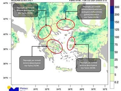Τα φαινόμενα, θα είναι περισσότερο γενικευμένα και πιο έντονα τις μεσημεριανές και απογευματινές ώρες, ενώ σε ορισμένες περιπτώσεις ενδέχεται να συνοδεύονται από χαλαζοπτώσεις. Τα εκτιμώμενα αθροιστικά ύψη βροχόπτωσης κατά τη διάρκεια της Τρίτης καθώς επίσης και οι περιοχές όπου υπάρχει αυξημένη πιθανότητα για έντονα φαινόμενα, παρουσιάζονται στον χάρτη.