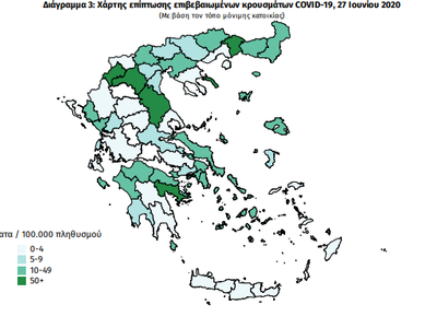 Τα στοιχεία που παρουσιάζονται αφορούν περιστατικά από την επιδημιολογική επιτήρηση της νόσου από το νέο κορωνοϊό (COVID19), με βάση τα δεδομένα που έχουν δηλωθεί στον ΕΟΔΥ και καταγραφεί μέχρι τις 27 Ιουνίου 2020 (ώρα 15:00).