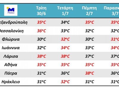 Αναλυτικά ο πίνακας του meteo.gr με τις θερμοκρασίες από Τρίτη (30/6) έως Παρασκευή (3/7)