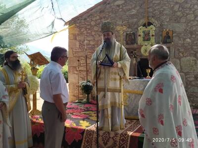 Μετά τό πέρας τῆς Θείας Λειτουργίας ὁ Μητροπολίτης Πατρών προσέφερε τιμητική πλακέτα ἐκ μέρους τοῦ Ἐκκλησιαστικοῦ Συμβουλίου στούς κυρίους, Παναγιώτη Σκούτα καί Φώτιο Καρβελᾶ γιά τίς πολλές ὑπηρεσίες τους στό τόπο καταγωγῆς τους, στό Λεόντιο καί γενικότερα στήν κοινωνία.