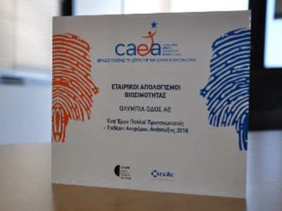 Μια πολύ σημαντική διάκριση, στην κατηγορία «Εταιρικός Απολογισμός Βιωσιμότητας», απέσπασε η Ολυμπία Οδός στα Corporate Affairs Excellence Awards που διοργάνωσε ο Τομέας Εταιρικών Υποθέσεων (ΤΕΥΠ) της Ελληνικής Εταιρίας Διοίκησης Επιχειρήσεων (ΕΕΔΕ), όπως αναφέρει σχετική ανακοίνωση και συνεχίζει: "Ειδικά στην κατηγορία στην οποία διακρίθηκε η Ολυμπία Οδός, τα κριτήρια για την αξιολόγηση των Απολογισμών Βιωσιμότητας θεσπίστηκαν από το ΤΕΥΠ σε συνεργασία με την Επιτροπή Εταιρικής Υπευθυνότητας του Ελληνοαμερικανικού Εμπορικού Επιμελητήριου. Είναι, επίσης, αξιοσημείωτο ότι φέτος ο θεσμός κατέγραψε ρεκόρ στην ιστορία του με 133 υποψηφιότητες, ενώ για πρώτη φορά η Deloitte Ελλάδος πιστοποίησε την ασφαλή και ορθή λειτουργία της διαγωνιστικής διαδικασίας.