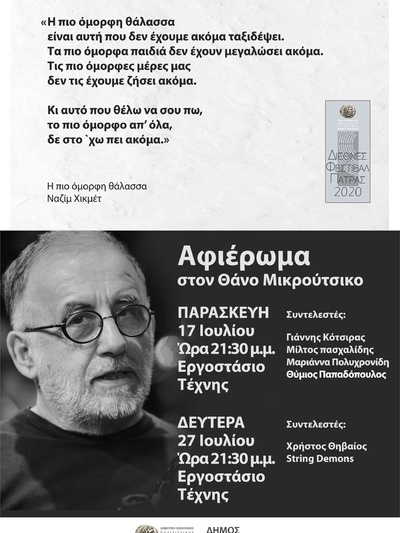 Όλα είναι έτοιμα για να τιμήσει η Πάτρα στις 9.30 το βράδυ της ερχόμενης Παρασκευής 17 Ιουλίου τον Θάνο Μικρούτσικο, μέσα από την πραγματοποίηση της μίας εκ των δύο συναυλιών της ενότητας – αφιέρωμα του Διεθνούς Φεστιβάλ, στον μεγάλο πατρινό συνθέτη.