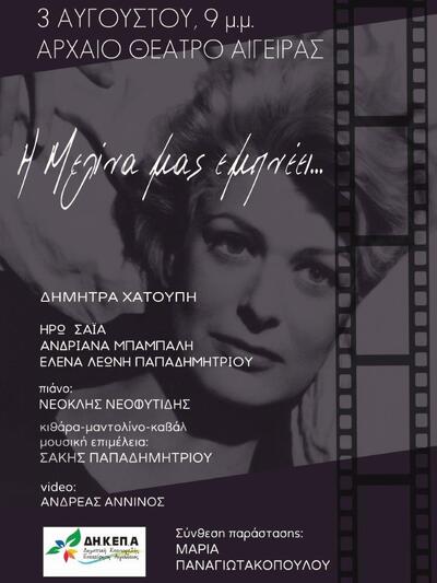 Η ΔΗ.Κ.ΕΠ.Α παρουσιάζει τη μουσική παράσταση της Μαρίας Παναγιωτακοπούλου, «Η Μελίνα μας εμπνέει…» που θα λάβει χώρα στο αρχαίο θέατρο της Αιγείρας στις 3 Αυγούστου και ώρα 21:00. Πρόκειται για μια ατμοσφαιρική παράσταση που θα πραγματοποιηθεί κάτω από το φως της πανσελήνου, και θα είναι αφιερωμένη στη Μελίνα Μερκούρη μέσα από κείμενα δικά της για τη ζωή της, την καριέρα της ως ηθοποιού και ως πολιτικού, την αντιστασιακή της δράση στη χούντα αλλά και μέσα από τα τραγούδια της και τους σημαντικούς ρόλους που έχει ερμηνεύσει.