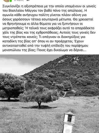 "Συγκλονίζει η αξιοπρέπεια με την οποία υπομένουν οι γονείς του Βασιλείου Μάγγου τον βαθύ πόνο της απώλειας. Η αγωνία κάθε ανήσυχου πολίτη γίνεται πλέον οδύνη γα όσους χαράσσουν τέτοια εσωτερικά μέτωπα. Θα χρειαστεί να θρηνήσουμε κι άλλα θύματα για να ξυπνήσουν οι μετριοπαθείς; Ή τελικά τους εκφράζει αυτό το απαράδεκτο χάλι της βίας και της εχθροπάθειας; Αυτούς τους γονείς δεν τους ντρέπεται κανείς; Τι απέγιναν οι διακυρήξεις για καταδίκη της βίας από όπου και άν προέρχεται; Έχουν αντικατασταθεί από την τυφλή επίδειξη του περίφημου μονοπωλίου της βίας; Ποιος έχει δικαίωμα να δέρνει..."
