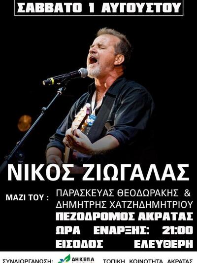 Μια «δυνατή» καλοκαιρινή συναυλία έρχεται από την ΔΗ.Κ.ΕΠ.Α. στο πλαίσιο του πολιτιστικού καλοκαιριού 2020, στον πεζόδρομο Ακράτας το Σάββατο 1 Αυγούστου στις 21:00. Ο Νίκος Ζιώγαλας δεν χρειάζεται συστάσεις!