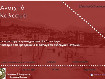 Με αφορμή την επικείμενη έκδοση του τόμου «Η Ιστορία του Εμπορικού & Εισαγωγικού Συλλόγου Πατρών» η διοίκηση του εμπορικού συλλόγου Πάτρας απευθύνει ανοιχτό κάλεσμα για διάθεση φωτογραφικού υλικού που να αφορά την κοινωνική, πολιτισμική, εμπορική ζωή της Πάτρας από τις αρχές του 19ου αιώνα μέχρι σήμερα.