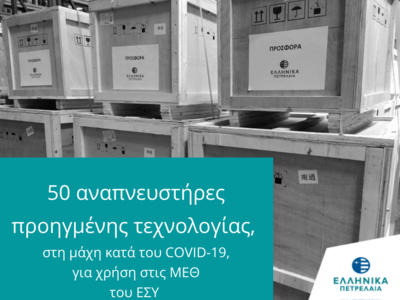 Ο Όμιλος ΕΛΛΗΝΙΚΑ ΠΕΤΡΕΛΑΙΑ συνεχίζει να στέκεται αρωγός στο Εθνικό Σύστημα Υγείας, προσφέροντας 50 αναπνευστήρες προηγμένης τεχνολογίας για τον εξοπλισμό των Μονάδων Εντατικής Θεραπείας. Οι αναπνευστήρες θα διατεθούν άμεσα από το Υπουργείο Υγείας για την κάλυψη των αναγκών στα νοσοκομεία αναφοράς για ασθενείς που νοσούν από τον COVID-19, στο πλαίσιο της συνεχιζόμενης μάχης για την αντιμετώπιση της πανδημίας.