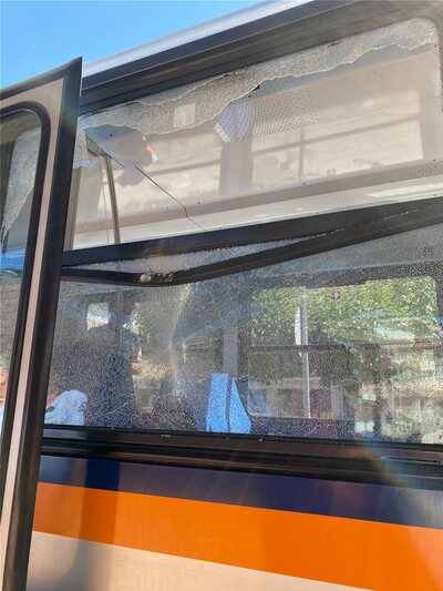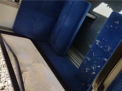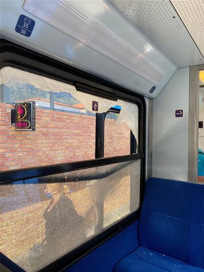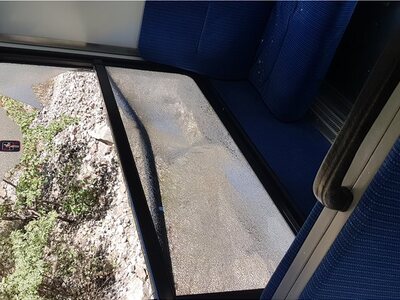 Τα τζάμια του παραθύρου σκορπίστηκαν μέσα στο βαγόνι και συγκεκριμένα στο βαγόνι 1, πάνω στους επιβάτες και στα καθίσματα. Προκλήθηκαν ζημιές και υπήρξαν ελαφρά τραυματίες από την εκτόξευση των γυαλιών στο πρόσωπο επιβάτη.