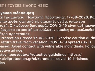 Μήνυμα στα κινητά τους από το 112 έλαβαν πολίτες στην Πάτρα, τη Λευκάδα και σε άλλα μέρη της Ελλάδας για τον κορωνοϊό. Η επείγουσα ειδοποίηση της Γενικής Γραμματείας Πολιτικής Προστασίας καλεί τους πολίετς κατά την επιστροφή τους από τις διακοπές να είναι ιδιαίτερα προσεκτικοί γιατί ο κίνδυνος διασποράς είναι μεγάλος. "Μην έρχεστε σε επαφή με ευάλωτες ομάδες και ακολουθείτε τα μέτρα προστασίας", αναφέρει μεταξύ άλλων.