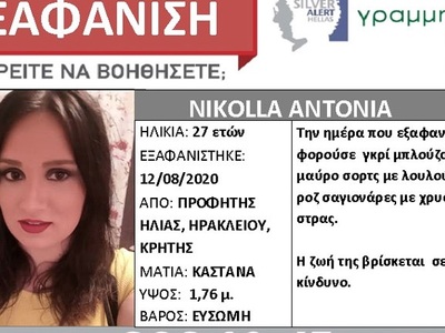 Άκαρπες είναι μέχρι στιγμής οι έρευνες των αρχών για την εξαφάνιση μίας 27χρονης από χωριό του Ηρακλείου. Σύμφωνα με το cretapost.gr, πρόκειται για την 27χρονη Αντωνία Νίκολα, τα ίχνη της οποίας χάθηκαν στις 12 Αυγούστου.