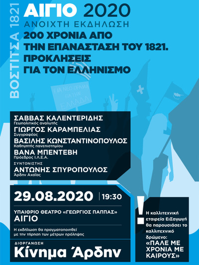 Tο περιοδικό Άρδην θα πραγματοποιήσει αυτό το Σάββατο 29 Αυγούστου 2020 στις 19.30 το απόγευμα, μία ανοιχτή εκδήλωση – συζήτηση με θέμα: «Διακόσια χρόνια από την Επανάσταση του 1821, προκλήσεις για τον ελληνισμό».