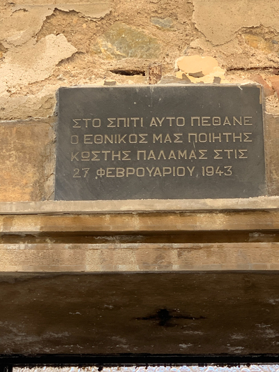 Μια πλάκα πάνω από την κύρια είσοδο του σπιτιού αναγράφει: «Στο σπίτι αυτό πέθανε ο εθνικός μας ποιητής Κωστής Παλαμάς στις 27 Φεβρουαρίου 1943».