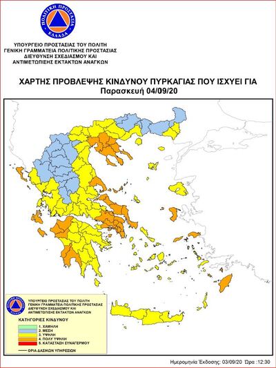 Στην κατηγορία κινδύνου 4 (πολύ υψηλή) θα βρίσκονται οι Περιφερειακές Ενότητες Αχαΐας, Ηλείας και στην κατηγορία κινδύνου 3 (υψηλή) η ΠΕ Αιτωλοακαρνανίας την Παρασκευή 4 Σεπτεμβρίου 2020, σύμφωνα με την πρόβλεψη της Γενικής Γραμματείας Πολιτικής Προστασίας όπως αποτυπώνεται στον επισυναπτόμενο ημερήσιο Χάρτη Πρόβλεψης Κινδύνου Πυρκαγιάς. Υπενθυμίζεται ότι και σήμερα Πέμπτη στη Δυτική Ελλάδα είναι υψηλός ο κίνδυνος πυρκαγιάς.
