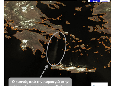 Ορατός από τον Ευρωπαϊκό μετεωρολογικό δορυφόρο Meteosat – 11 είναι ο καπνός από την πυρκαγιά στην Κερατέα. Όπως φαίνεται και στην εικόνα που ελήφθη στις 16:00 ώρα Ελλάδας, ο καπνός φτάνει έως τις βορειοδυτικές ακτές της Κρήτης.