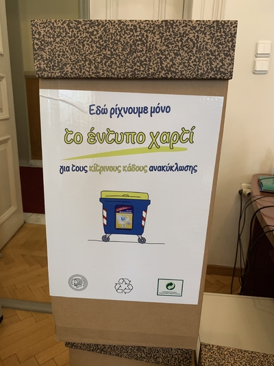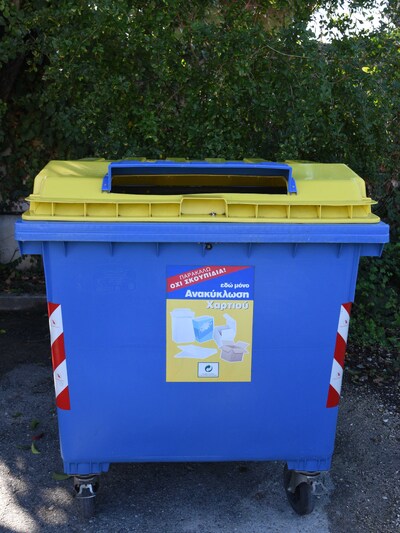 "Το έντυπο χαρτί (έντυπα, εφημερίδες, τυπωμένα χαρτιά, βιβλία) πρέπει να διαχωρίζεται από τα υπόλοιπα υλικά ανακύκλωσης και να ρίχνεται με τις λιγότερες δυνατές φθορές στους μπλε κάδους με τα κίτρινα καπάκια που έχουν τοποθετηθεί σε επιλεγμένα σημεία της πόλης. Υπενθυμίζεται ότι τα κίτρινα καπάκια είναι κλειδωμένα και η ρίψη των χαρτιών γίνεται από την ειδική σχισμή που διαθέτουν. Στους κάδους με κίτρινα καπάκια δεν πετάμε κανένα άλλο σκουπίδι ή υλικό ανακύκλωσης παρά μόνο έντυπο χαρτί.