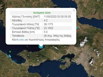 Ο Εγκέλαδος χτύπησε 50 χιλιόμετρα δυτικά/βορειοδυτικά της Αθήνας, σύμφωνα με το Γεωδυναμικό Ινστιτούτο του Εθνικού Αστεροσκοπείου Αθηνών. Το επίκεντρο της δόνησης εντοπίζεται στον θαλάσσιο χώρο 27 χιλιόμετρα νότια/νοτιοδυτικά της Θήβας.