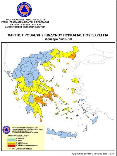 Συγκεκριμένα, σύμφωνα ύμφωνα με τον Χάρτη Πρόβλεψης Κινδύνου Πυρκαγιάς της Γενικής Γραμματείας Πολιτικής Προστασίας, για την Δευτέρα 14 Σεπτεμβρίου 2020, προβλέπεται: