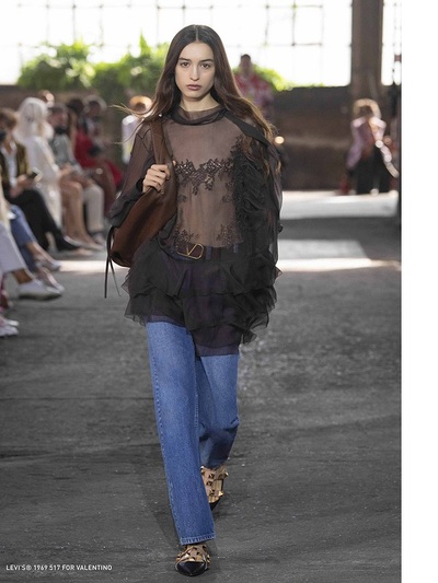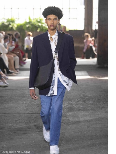 «Χαμός» όμως και με το Levis 517 που επανέφερε για άνδρες και γυναίκες ο ιταλικός οίκος Valentino στην πρόσφατη επίδειξή του στο Μιλάνο. Η «γραμμή» που είναι εμπνευσμένη από τα τζιν των sixties, αφήνει περιθώριο να φορέσουμε πολλά είδη παπουτσιών. Βγήκε στην πασαρέλα σε πρώην εργοστάσιο μεταλλουργίας για να σηματοδοτήσει την στροφή του luxury label στην πραγματικότητα της covid εποχής. Ο urban προσανατολισμός της σειράς Valentino x Levi’s 517 βασίζεται στην αιθέρια και πολυτελή άνω ένδυση συνδυασμένη με κλασικό, σκούρο μπλε bootcut παντελόνι. Λανσάρεται ήδη ως το must της επόμενης άνοιξης και έχει προκαλέσει πολλά δημοσιεύματα στα fashion media.