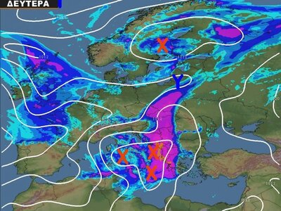 Βαρομετρικό χαμηλό από τη βόρεια Ιταλία συνοδευόμενο από μέτωπα κακοκαιρίας, αναμένεται να επηρεάσει τη χώρα μας και από τα βορειοδυτικά από τις πρωινές - μεσημεριανές ώρες αύριο Δευτέρα με ισχυρές βροχές - καταιγίδες, χαλάζι αλλά και θυελλώδεις νοτιάδες.